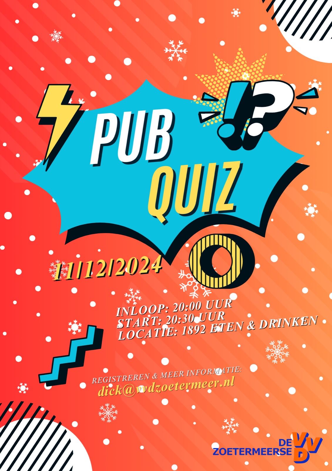 Hij is terug van weggeweest, de Kerst Pubquiz! Op woensdag 11 december sluiten we met elkaar het jaar af met een gezellige pubquiz en aansluitende borrel. Uiteraard kijken we terug op het nieuws en de actualiteiten van 2024, maar ook zal de Zoetermeerse politiek aan bod komen. En zoals altijd met veel gelach en een dikke knipoog. De Pubquiz vindt plaats op woensdag 11 december in 1892 De Graanschuur en begint om 20.30 uur, met inloop om 20.00 uur. Leden zijn gratis, niet-leden €5,-. Meer informatie volgt, maar aanmelden mag alvast via dick@vvdzoetermeer.nl. Tot dan!